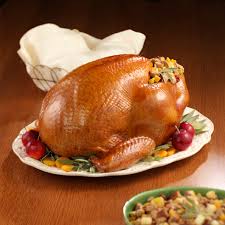 Place stuffed turkey on a rack with a shallow pan, and cover with a cloth soaked in melted fat. Occasionally moisten cloth with fat during roasting. Roast at 325 degrees from 4 1/2 hrs. for a 10 lb. turkey to 6 hrs. for a 15 lb. turkey. Test for doneness by moving a drumstick up and down; when the turkey is done, the drumstick will move readily. For easier carving, allow turkey to stand for 30 to 40 minutes.